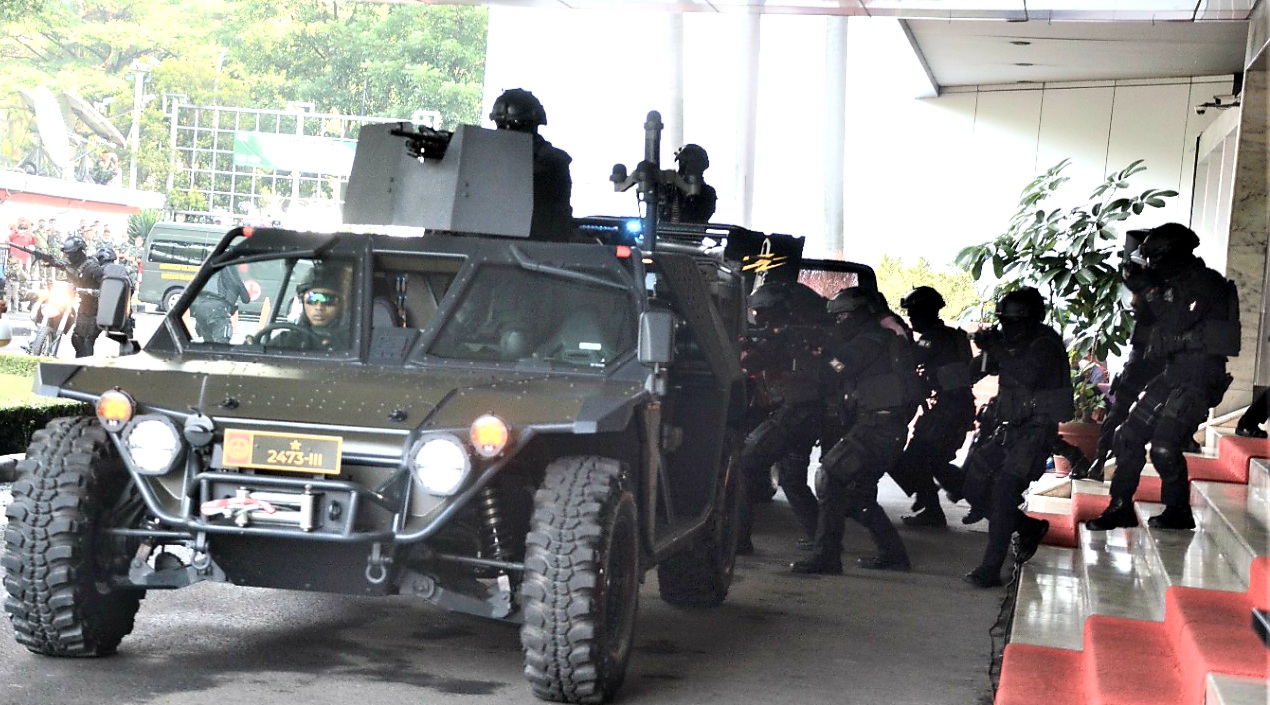 Bandung – Prajurit Satuan elite Kodam III/Siliwangi diterjunkan untuk membebaskan warga sipil yang disandera di Area Perkantoran PT. Telkom, Jalan Japati No. 1 Kota Bandung, Jawa Barat, Sabtu (18/12/2021).