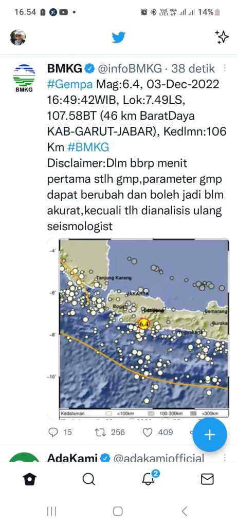 “#Gempa Mag:6.4, 03-Dec-2022 16:49:42WIB, Lok:7.49LS, 107.58BT (46 km BaratDaya KAB-GARUT-JABAR), Kedlmn:106 Km #BMKG