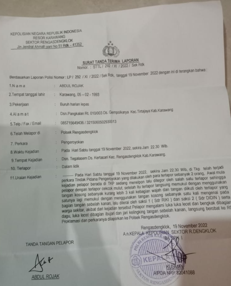 Rojak juga menyampaikan atas kejadian pengeroyokan yang menimpa dirinya, seketika itu dia langsung melaporkan kasus tersebut ke Kepolisian Sektor (Polsek) Rengasdengklok dengan Laporan terdaftar Nomor STTL/292/XI/2022/Sek RDK.