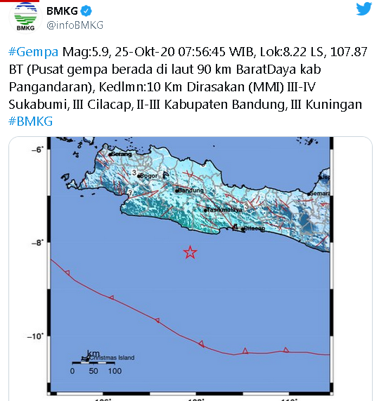 BKMG menyebut gempa yang terjadi di Kabupaten Pangandaran tidak berpotensi tsunami Namun demikian, pihak BKMG belum menulis rincian terkait dengan gempa yang terjadi pada Minggu ( 25/10/2020) pagi tersebut.(er/son).