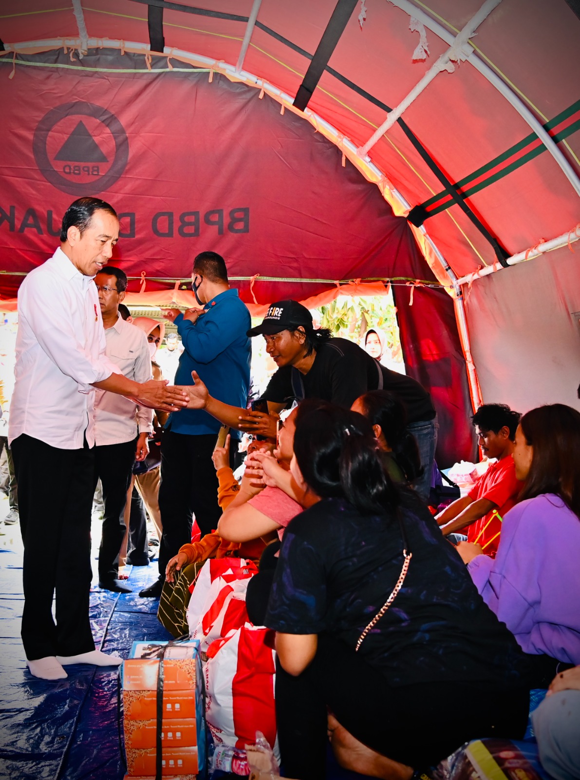 Tiba sekitar pukul 09.50 WIB, Presiden dan Ibu Iriana melihat langsung kondisi para korban yang tengah mengungsi di tenda-tenda darurat. Presiden dan Ibu Iriana juga berdialog dan membagikan makanan kepada para pengungsi yang ada di tenda.