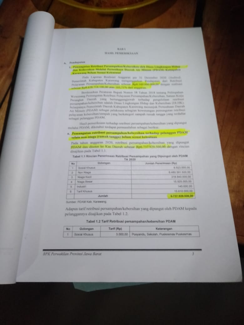 Pemberitaan sebelumnya, pada edisi Jumat 14 Oktober 2022, berdasarkan hasil pemeriksaan BPK RI Tahun 2020 terkait pungutan restribusi sampah yang dikelola PDAM, Pemkab Karawang menganggarkan RPPK sebesar Rp.8.349.000.000 dengan realisasi sebesar Rp. 8.658.714.100 atau 103,71 persen dari yang di anggaran.