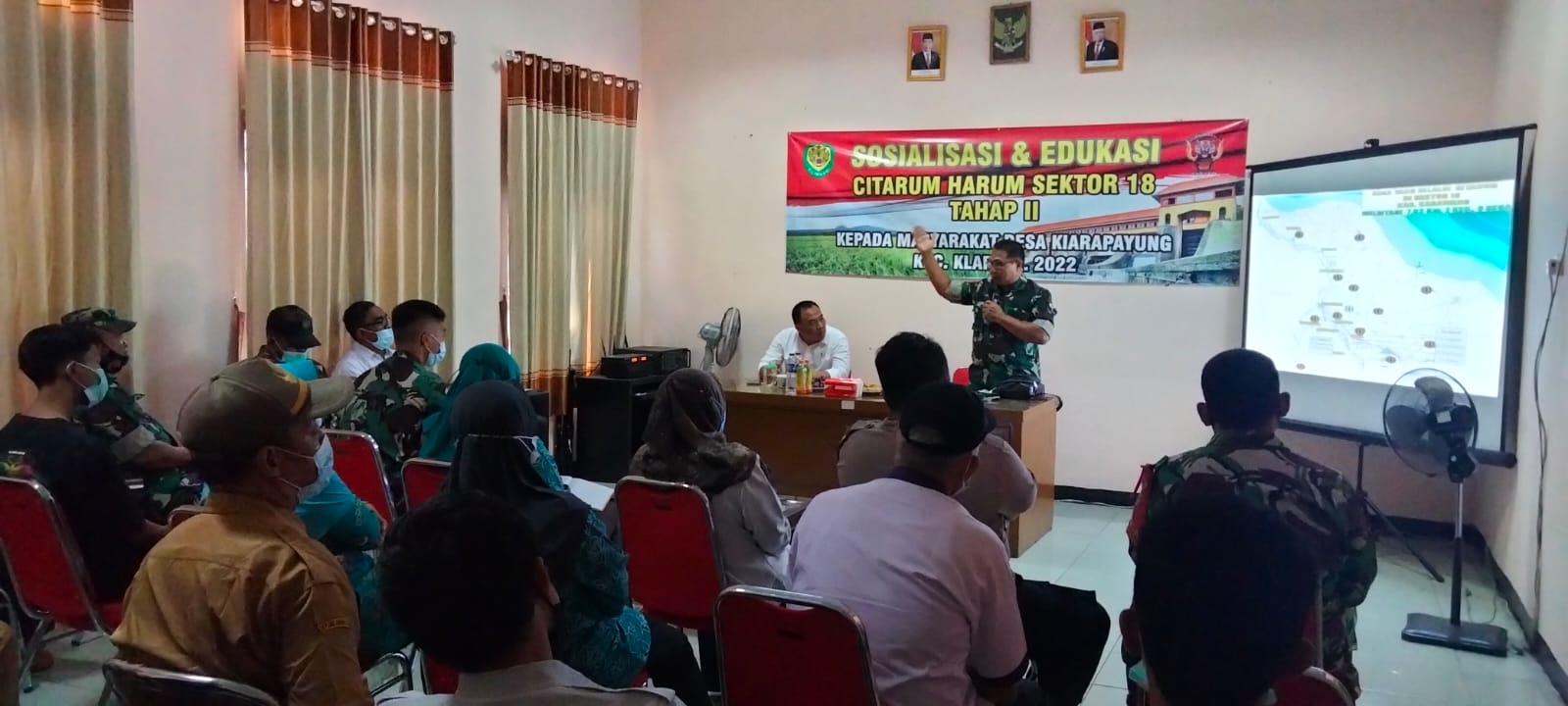 Acara sosialisasi dan edukasi TA 2022 Satgas Citarum Harum sektor 18 dihadiri Kepala Desa Kiarapayung Murdin Zaenudin, S.E beserta staf dan aparatur desa serta tokoh masyarakat, Bhabinkamtibmas, Babinsa juga personil Satgas Citarum Harum.(dd).