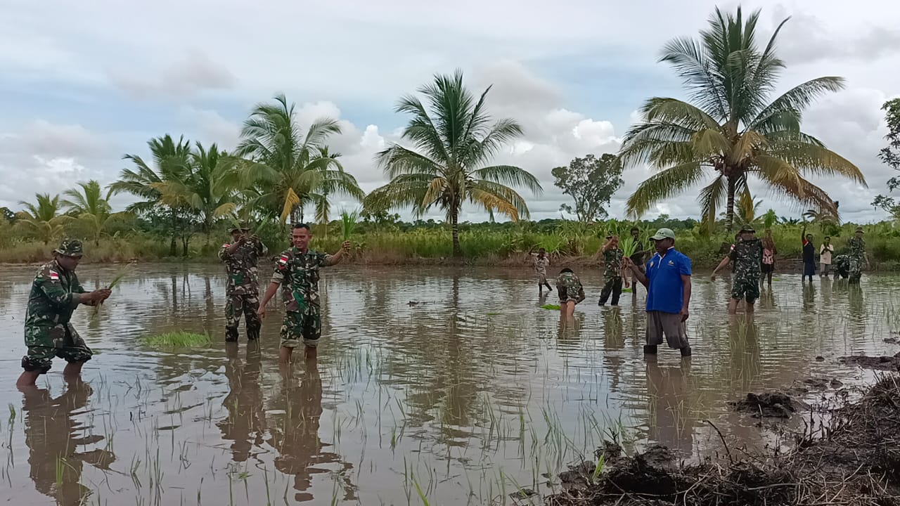 Newsnet.id = Dukung program ketahanan pangan, Satgas Yonif 315/Garuda mendampingi dan membantu masyarakat pada musim tanam padi, mengolah sawah hingga penanaman padi sawah di Kp. Kiworo Distrik Kimaam Kabupaten Merauke, Senin (21/03/2022).