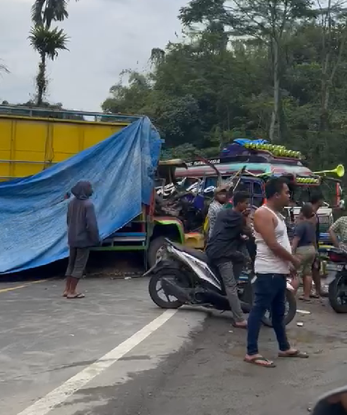 TRANSJABAR.COM | Sebuah kecelakaan terjadi di Jln Letjen Jamin Ginting, Bingkawan, Kecamatan Sibolangit, Kab Deli Serdang antara truk diesel bermuatan serat kayu dengan bus 3/4, pada Jumat, (10/2/2023), sekitar pukul 15.15 Wib.