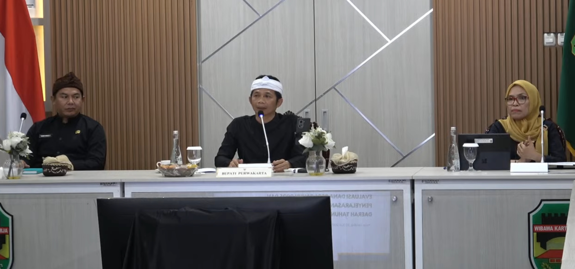 Salah satunya rapat yang ditayangkan secara langsung / live rapat yang digelar di Aula Janaka, Setda Purwakarta dengan tema Evaluasi Dana Desa tahun 2025 dan Penyelarasan Program Infrastruktur tahun 2026.