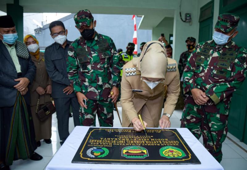 Purwakarta|Newsnet.id – Bupati Purwakarta Anne Ratna Mustika bersama Danrem 063 SGJ Cirebon, Kolonel Inf Elkines Villando Dewangga Kusumawide beserta Dandim 0619 Purwakarta Letkol ARM Krisrantau Hermawan resmikan gedung Komando Rayon Militer (Koramil) 1907 yang berlokasi di Desa Dangdeur Kecamatan Bungursari, Purwakarta, Senin (8/2/2021).