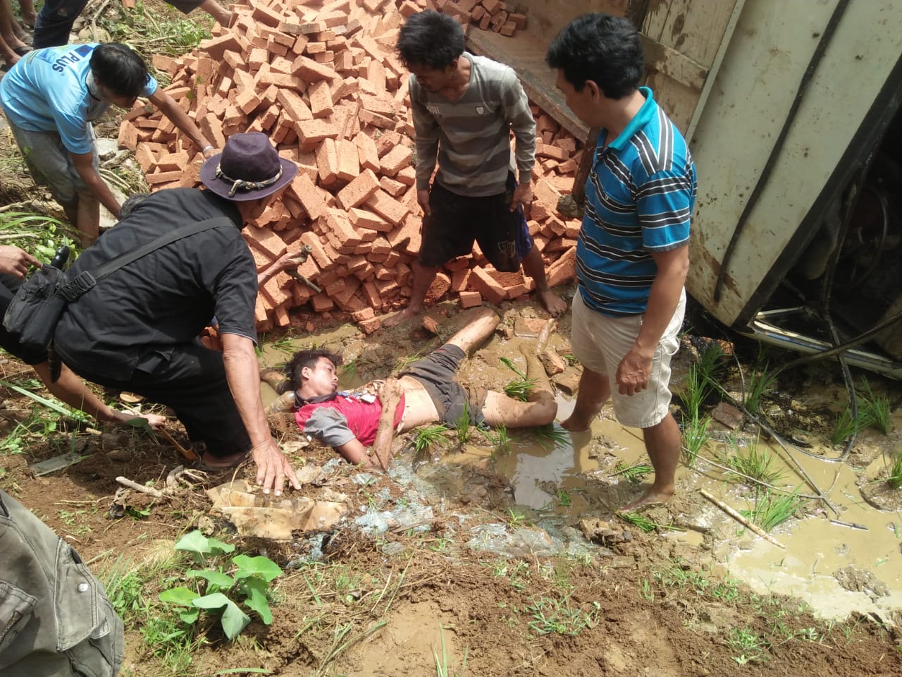” Truk mundur, sekitar 10 meter dari tanjakan, mobil terguling ke pematang sawah,” katanya.