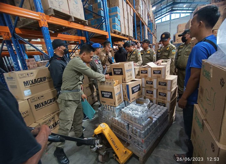 TRANSJABAR.COM | Satpol PP Kota Tasikmalaya bekerjasama dengan sejumlah Laskar Islam yang berada dibawah koordinasi AL-MUMTAZ berhasil membongkar usaha peredaran minuman keras beralkohol tinggi di Kota santri di sebuah gudang Makanan yang beralamat di Jl. Ir. H. Djuanda, Kota Tasikmalaya pada hari Senin (26/06/2023).